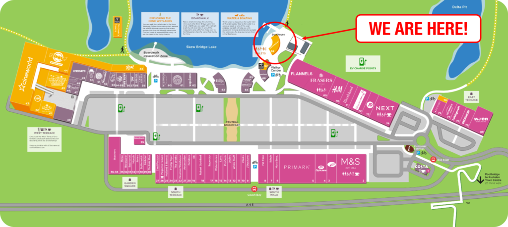 You can find us at: The Boathouse, Boardwalk, Rushden Lakes, Northamptonshire, NN10 6FA